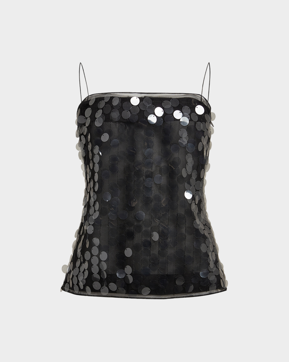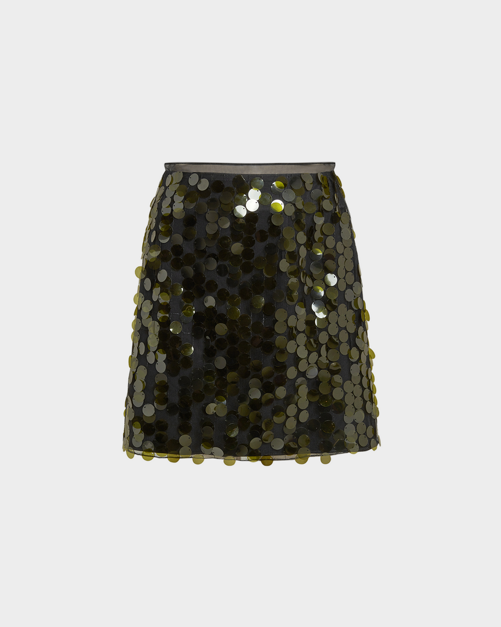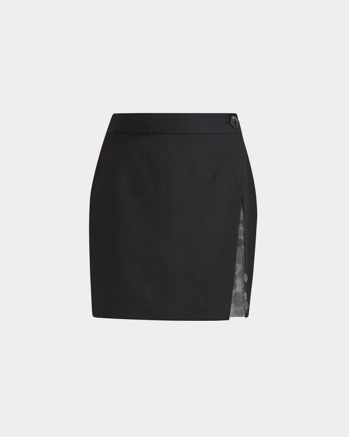 The Noelia Mini Skirt is a wrap style skirt that fastens with a button on the waist. It features a grey film sequin layer that peaks out from a slit in the skirt. It is designed to fit closely to the body and falls above the knees