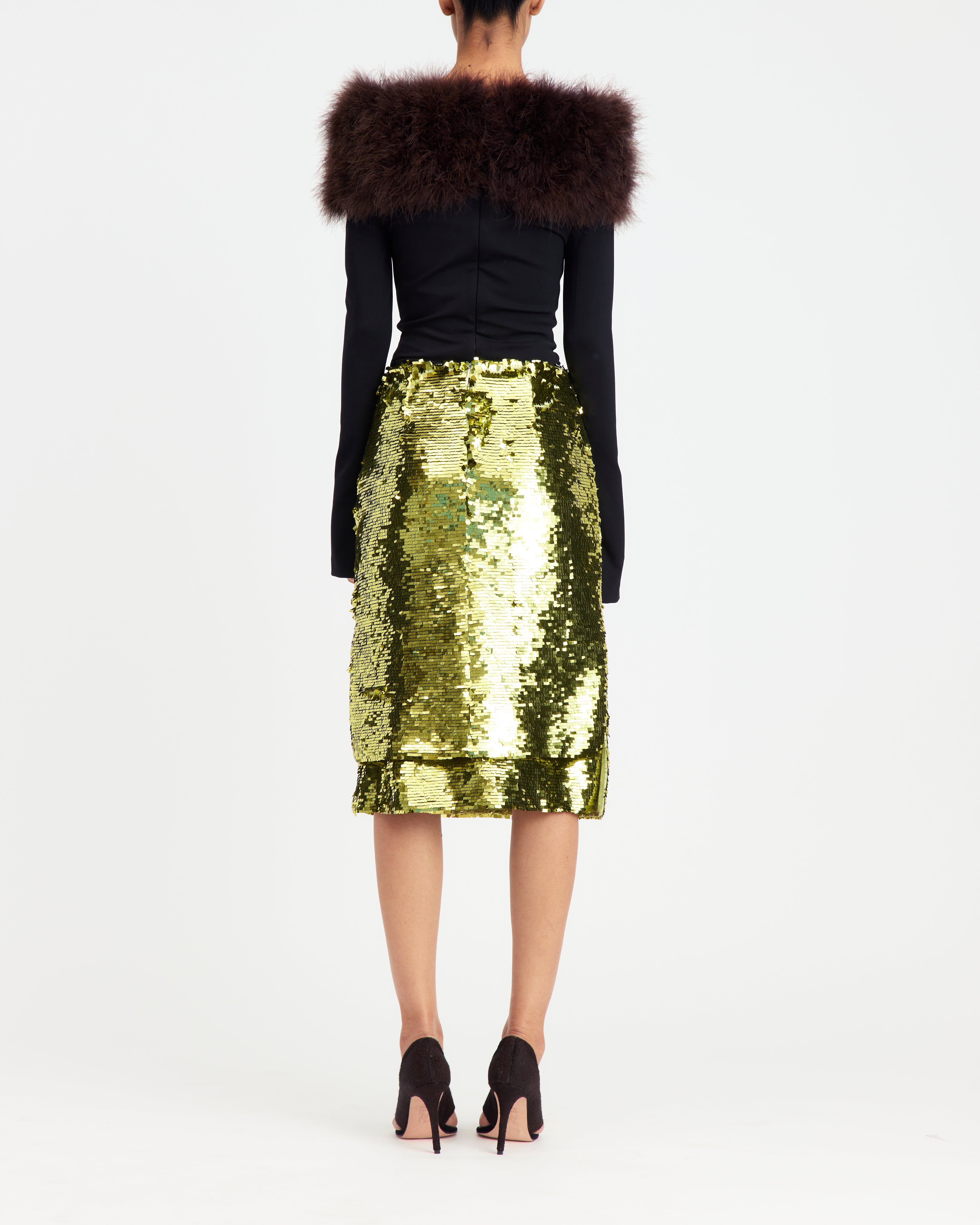 The Nyla skirt is a layered midi that sits at the mid-waist, cut from textured golden green square sequins with a matching golden green sequin underskirt. The layered construction adds depth and dimension, letting the sequins catch the light across the surface.