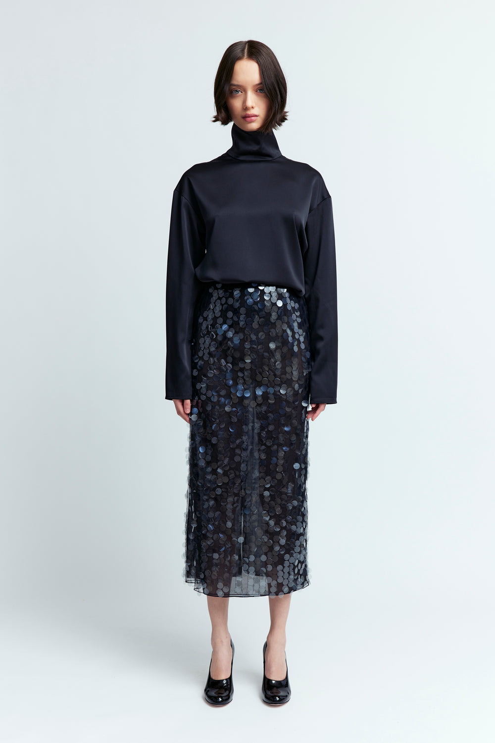 The Olall Top in black sequin is a funnel neck long sleeve. It is a sheer top covered in grey paillette embellishments to add an exciting 16Arlington element. It can be fastened at the back with a zip that reaches all the way to the neck. The Olall Top is also available in textured tassel and crepe.