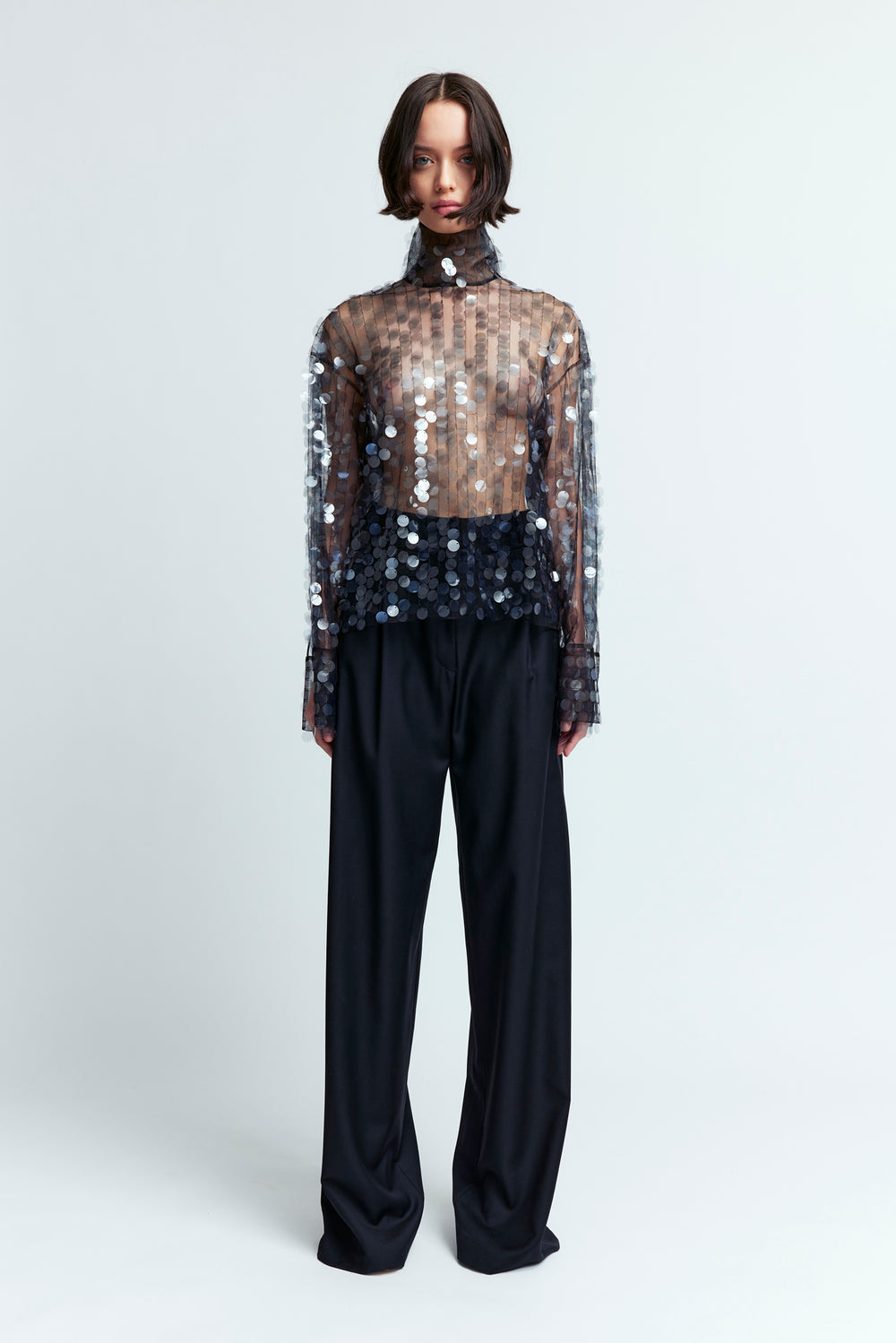 The Olall Top in off white features a sleek funnel neck and long sleeves, crafted from satin crepe for a fluid drape. A concealed zip at the back extends to the neckline for a secure fit. Also available in sequin and textured tassel.