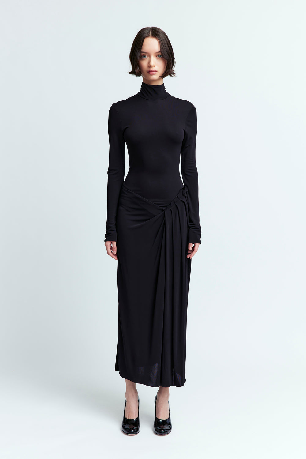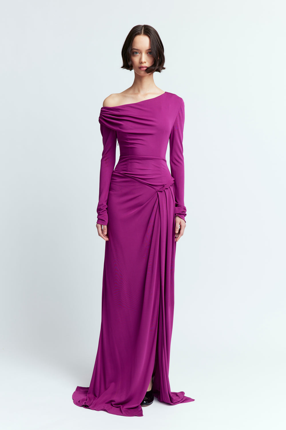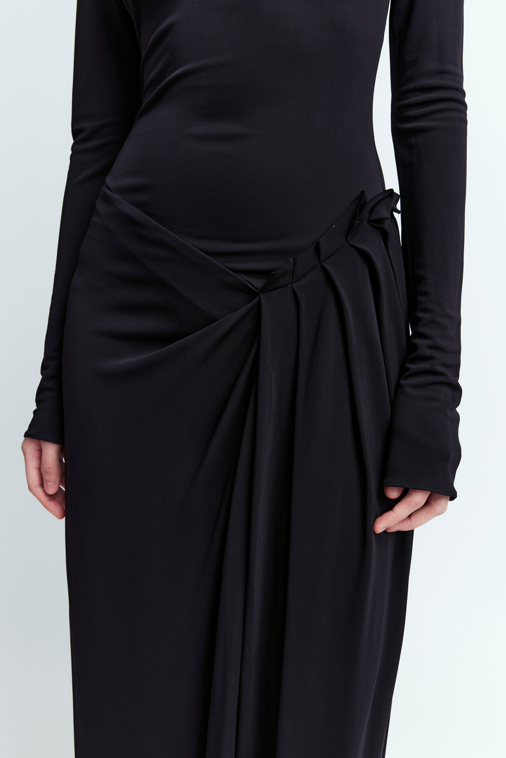 The Polyta Gown in black is a one shoulder, floor length dress. It features long sleeves and has an asymmetrical neckline. The gown includes subtle ruching and has a pleated detail along the hip to add a draped effect to the dress. It can be fastened up at the side with a zip and this dress is also available in pink