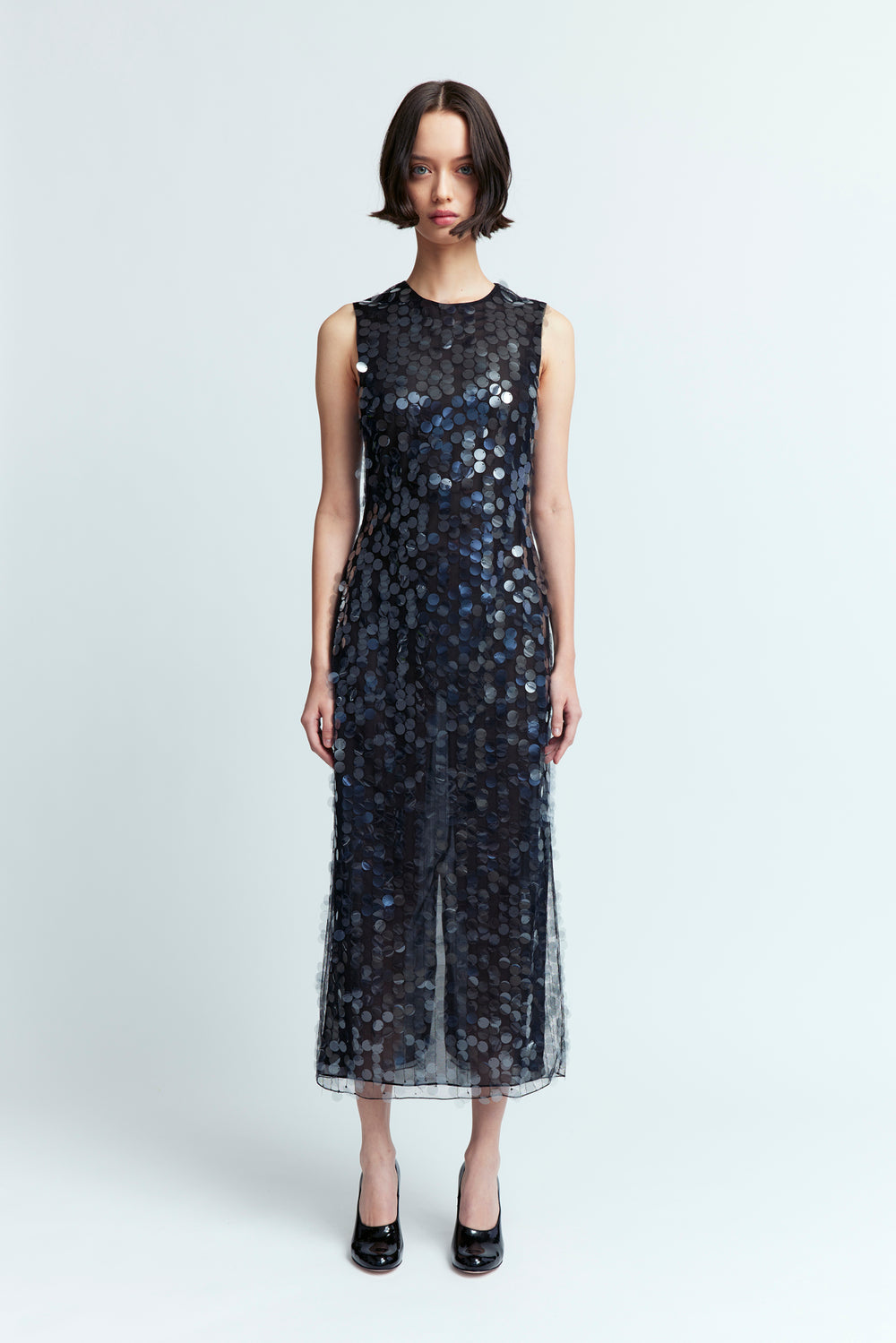 The Salia Gown in black is a floor-length dress with thin straps that tie at the low-cut back. The bodice features grey paillette sequins embroidered on sheer mesh, creating a scaled effect. A gathered georgette skirt flows effortlessly, contrasting with the fitted, sequin-embroidered bodice for a dynamic silhouette.