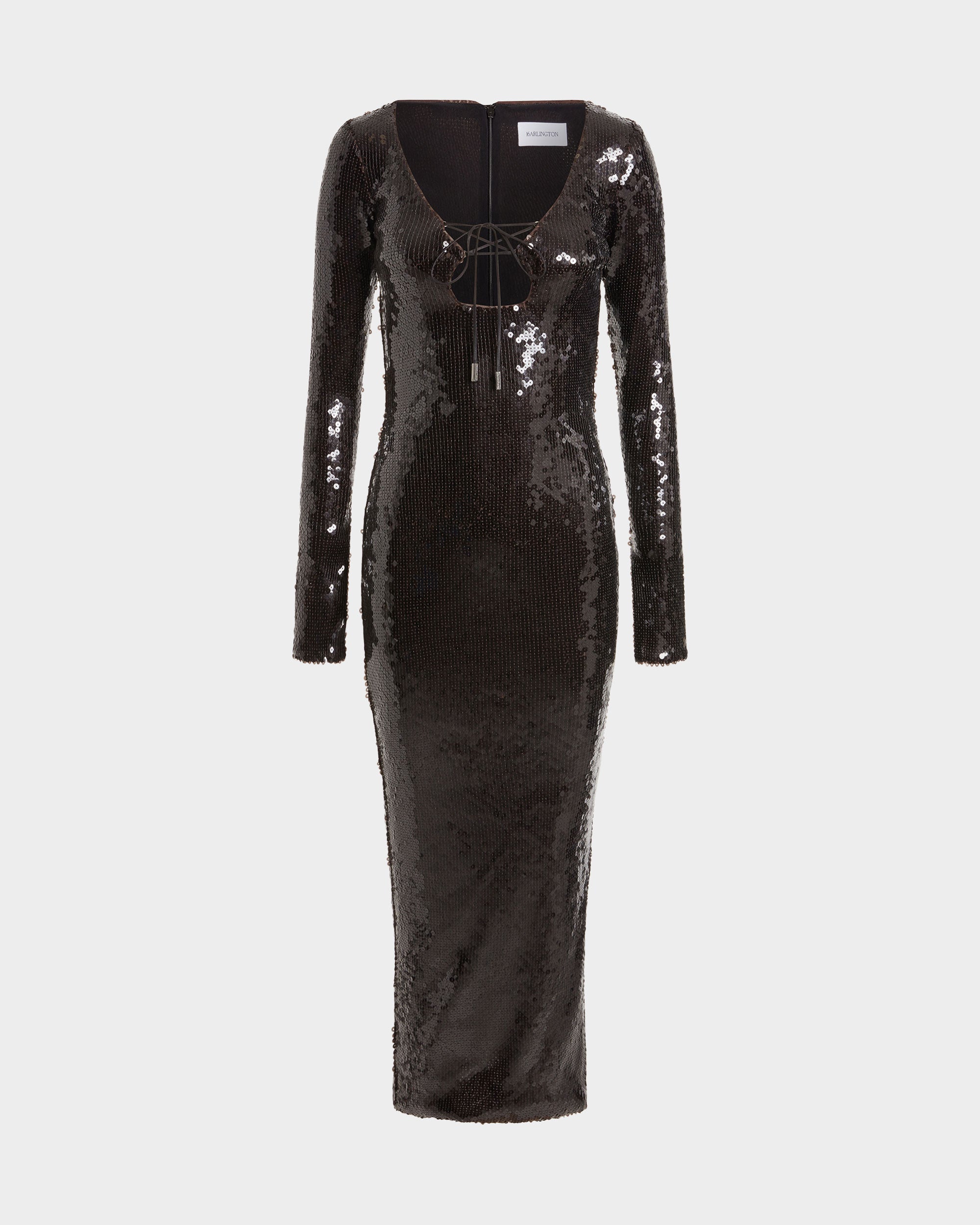 The Solaria dress is cut from subtle sheer sequin fabric in dark chocolate, lined with mesh for comfort and a gently cinched fit. Fitted through the body, it has long sleeves and a skirt that falls just below the knees. A cut-out at the neckline is laced with a branded metal-tipped cord, creating a functional, material accent.