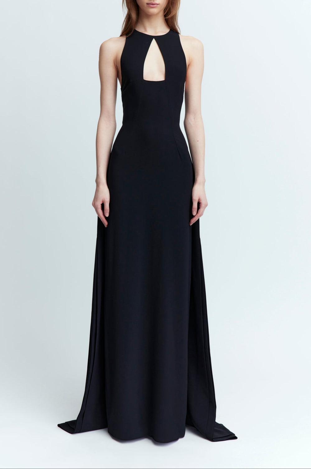 The Spyri Midi Dress in black is a midi dress with a keyhole cut out on the chest. It has a racer neckline and closes at the back with a zip. The dress falls below the knee and is designed to fit close to the body. More of the georgette cut out can be seen in the Anafri Gown and Desde Top