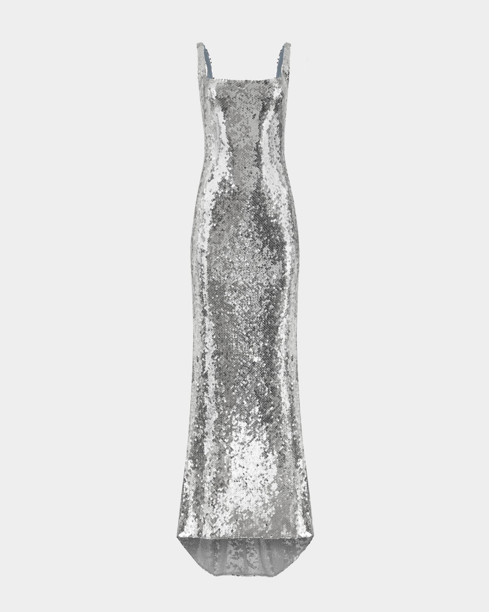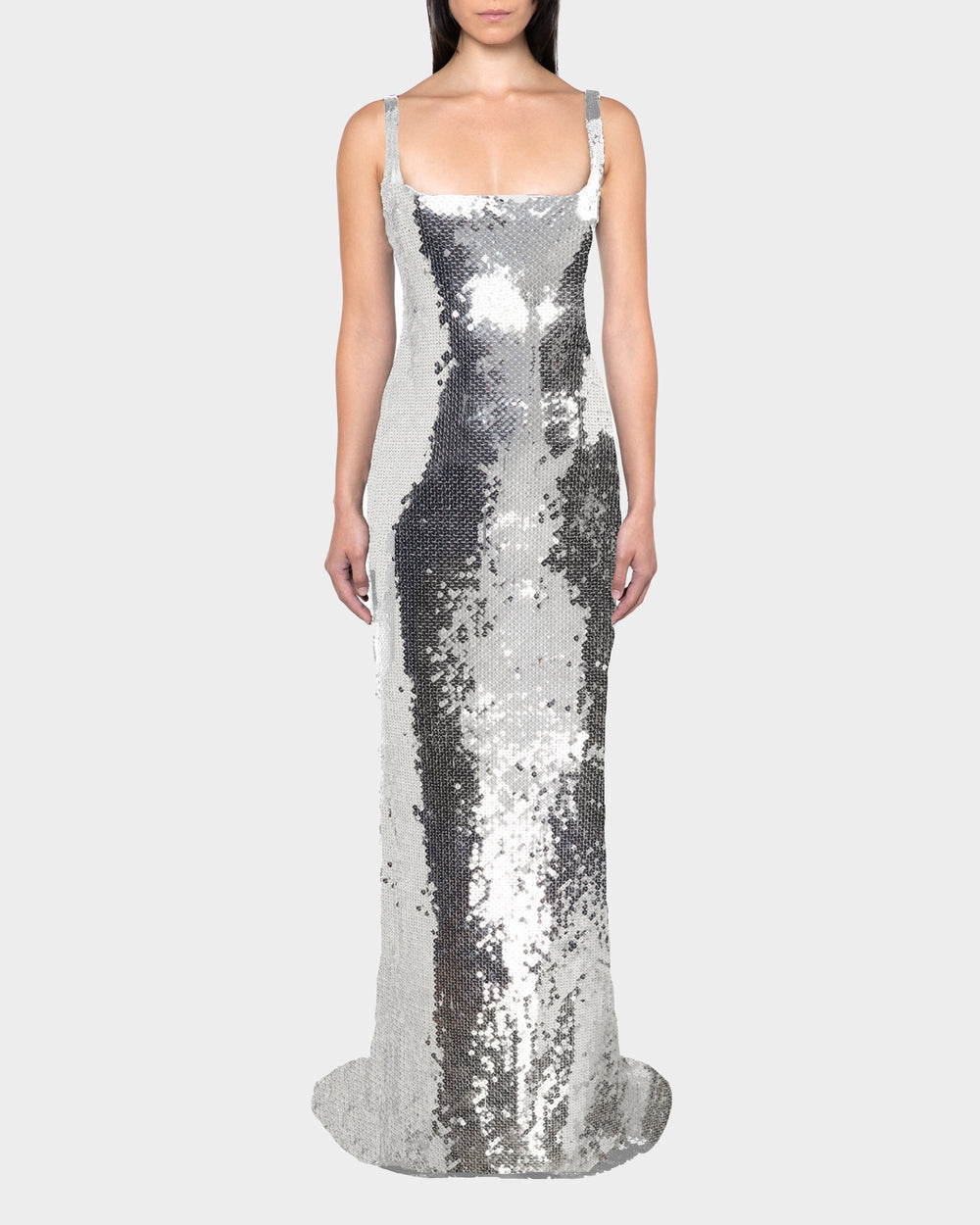 Zegli Gown features a sleeveless, backless silhouette with a high turtleneck and an open back secured by thin spaghetti straps that fall into a draped cowl detail. Cut in green sequins layered over lilac lace, it falls into a floor-length hem with a subtle train.